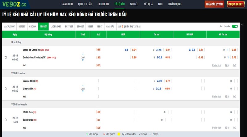 Trong rất nhiều loại kèo, mình đánh giá cao tỷ lệ kèo 88 vì độ phổ biến và tính ổn định. Trên Ve Bo TV, nhóm kèo này được hiển thị khá rõ: