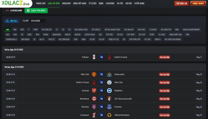 - Hoặc truy cập “Lịch bóng đá Anh” để kiểm tra các trận sắp diễn ra và chọn link xem trực tiếp.